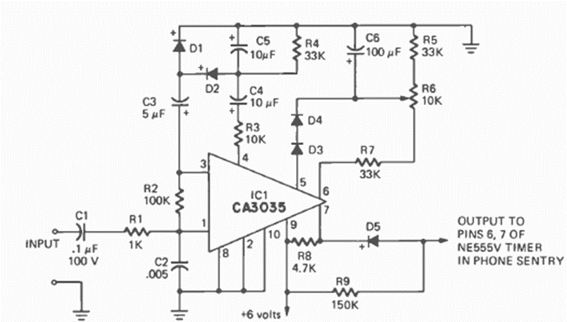 Este antiguo circuito de voz apto para teléfonos de la época fue encontrado en una Radio Electrónica de septiembre de 1973. El circuito está alimentado por una tensión de 7 V.