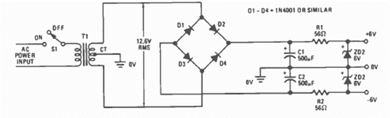 Este circuito lo encontramos en la revista Radio Electronics de mayo de 1977. La tensión del transformador es de 6+6 V y la corriente depende de los diodos zener, siendo del orden de 100 a 200 mA.