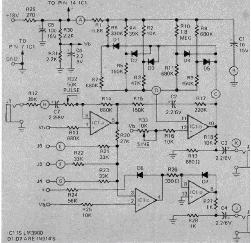 Este circuito para efectos musicales y sintetizadores se encontró en una radioelectrónica de junio de 1974. El circuito también consta de un modulador de ancho de pulso.