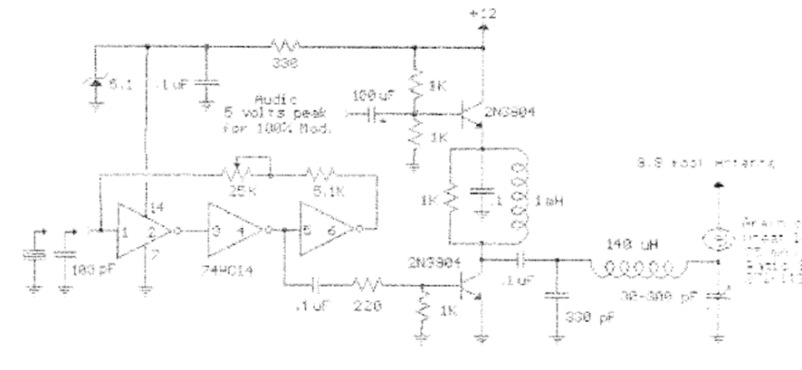 La corriente de reposo de un transmisor pequeño es del orden de 20 mA. La frecuencia de transmisión depende de la bobina y puede estar entre la banda de onda media y la banda de onda corta. El circuito procede de documentación de los años 80. La potencia ronda los 100 mW.