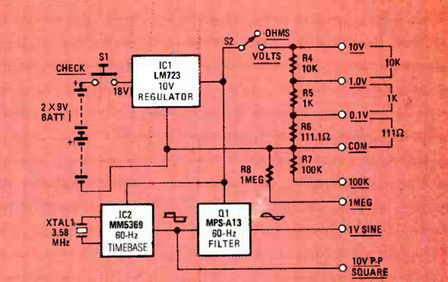 Este circuito se encontró en la revista Radio Electronics de junio de 1982. Proporciona tensiones de referencia para calibrar instrumentos como osciloscopios.