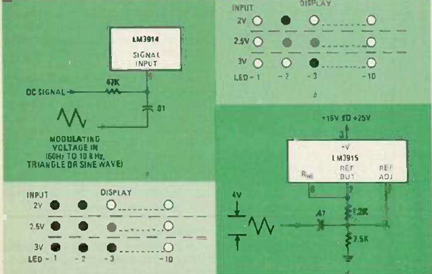 En la figura tenemos la forma de modificar la resolución del LM3914, un conocido gráfico de barras. La sugerencia apareció en un artículo de la revista Radio Electronics en octubre de 1980.