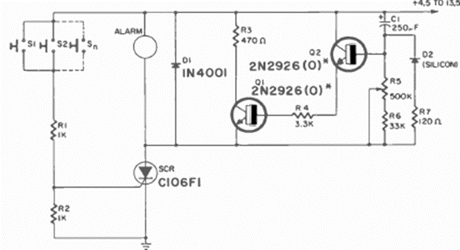 Encontrado en la revista Radio Electronics de julio de 1970, este circuito tiene un tiempo de activación regulable y depende del capacitor C1. El SCR puede ser equivalente a la serie 106.