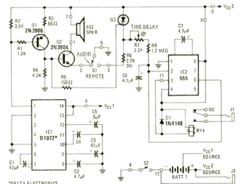 Este circuito lo encontramos en la revista Radio Electronics de abril de 1979. El circuito está basado en el 555 y un circuito integrado de la época, incluyendo el aviso sonoro y la activación de un relé.