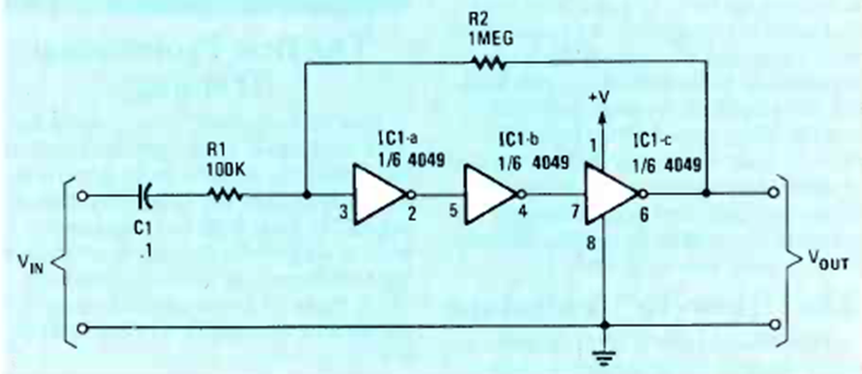 En la figura vemos cómo utilizar inversores CMOS como amplificadores. El circuito es de una Radio Electronics de abril de 1984. La tensión de alimentación puede estar entre 3 y 12 V.