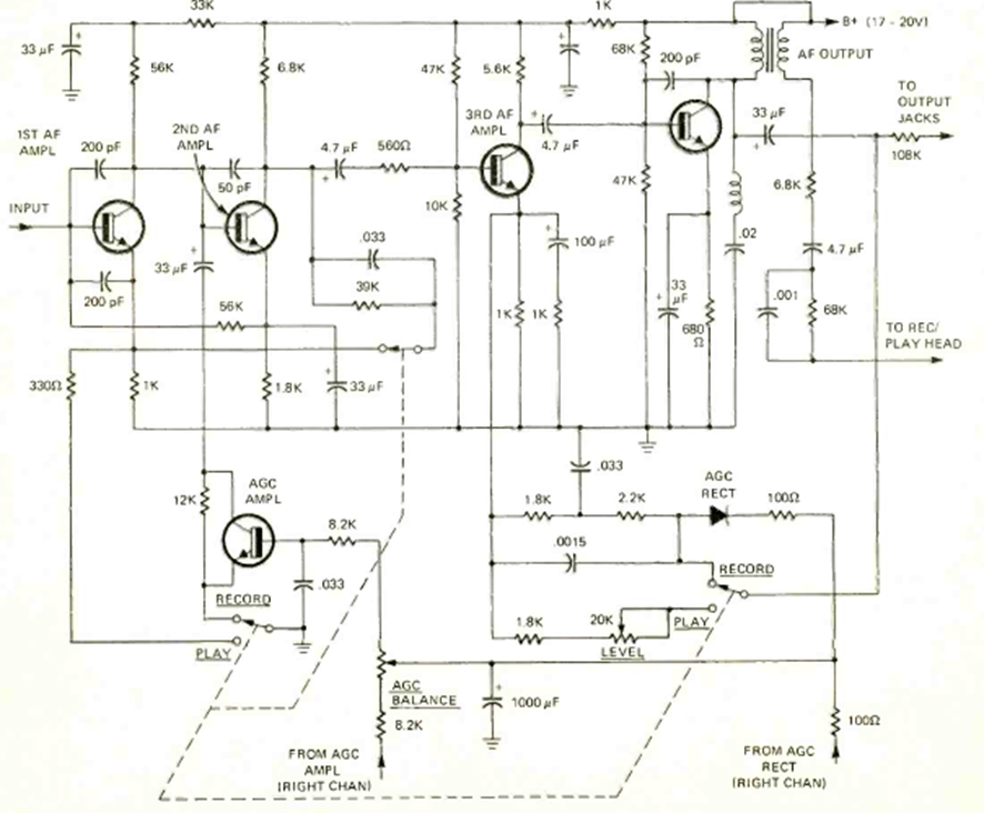 Este circuito para grabadoras antiguas lo encontramos en la revista Radio Electronics de diciembre de 1972. El circuito utiliza 4 transistores y debe alimentarse con las tensiones indicadas. No se proporciona la fuente.