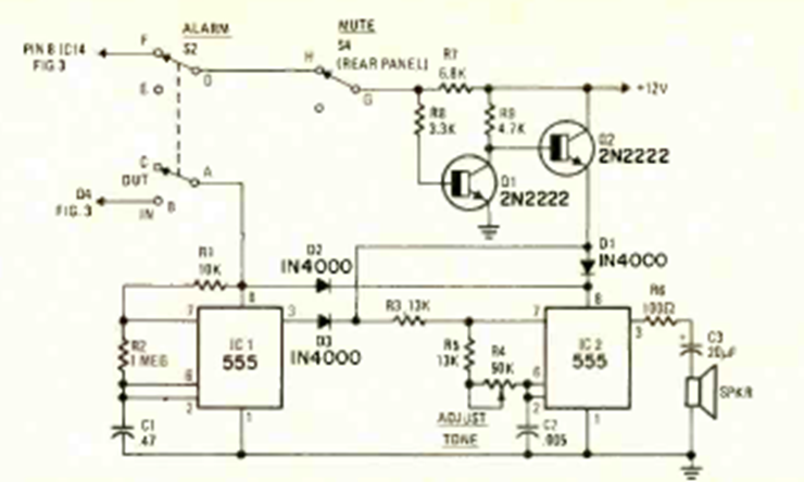 Este circuito basado en el 555 fue encontrado en la revista Radio Electronics de agosto de 1976. Las frecuencias de los tonos vienen dadas por los capacitores al lado del 555.