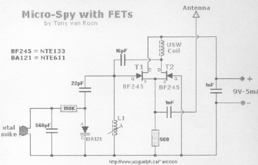Este circuito es de documentación de los años 90. El transistor puede ser cualquier FET de uso general como el BF245, como se indica, y la bobina consta de 4 vueltas de alambre de 0,5 cm 28 sin núcleo para la banda FM.