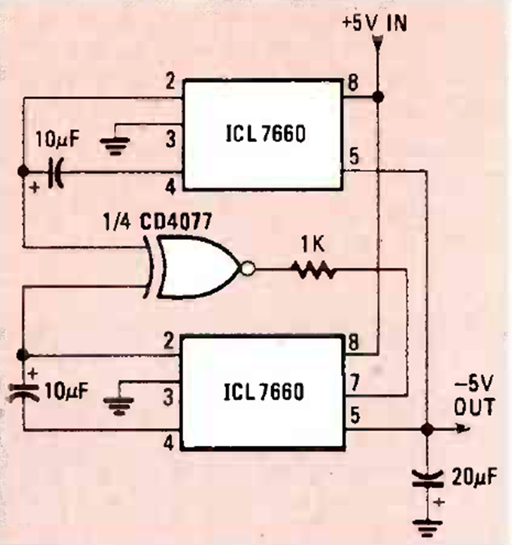 Con este circuito es posible obtener un voltaje de -5 V de una fuente de 5 V. El circuito es de una Radio Electrónica de mayo de 1982. La corriente máxima ronda los 80 mA.
