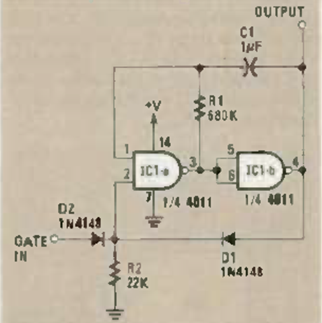 Este circuito tiene una salida normalmente en nivel bajo y se activa mediante un pulso alto. El circuito es de una Radio Electrónica de noviembre de 1984. La frecuencia viene dada por C1.