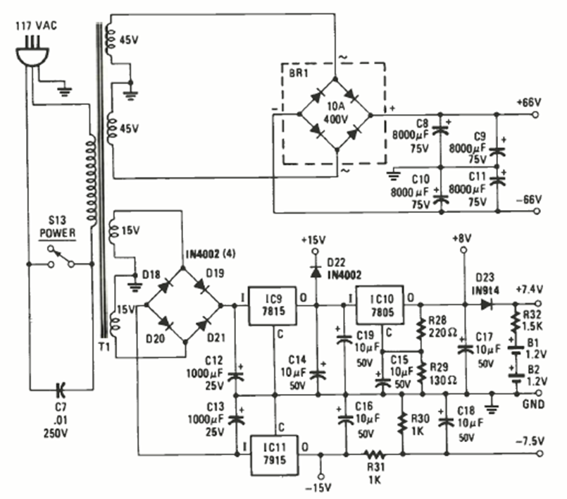 Esta es la fuente de alimentación del amplificador del circuito anterior. Los reguladores de tensión deben estar equipados con un disipador de calor y el transformador debe ser de alta corriente.