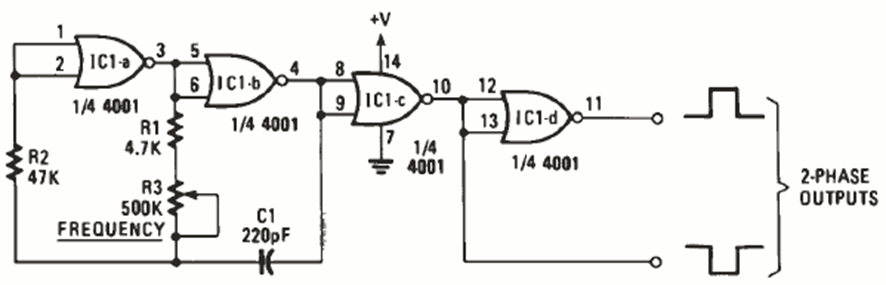 Esta es una configuración de oscilador común que genera señales rectangulares en oposición de fase. Este circuito es de una Radio Electronics de octubre de 1986.