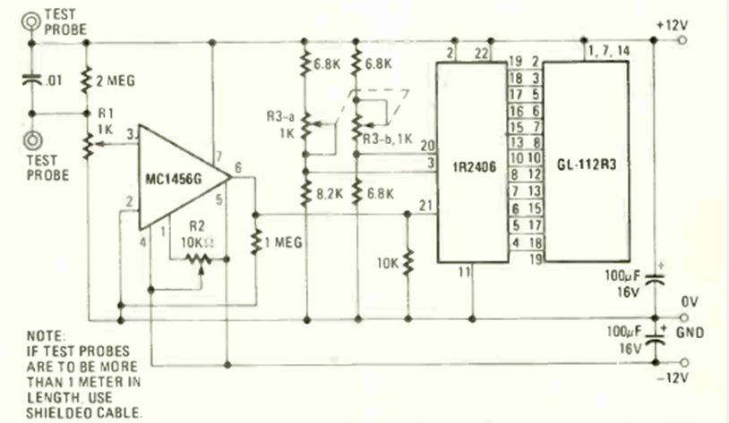 Encontramos este circuito en la revista Radio Electronics de octubre de 1979. Utiliza un indicador de gráfico de barras 7016, pero se pueden emplear otros equivalentes. R2 realiza el ajuste de compensación o nulo del amplificador operacional.