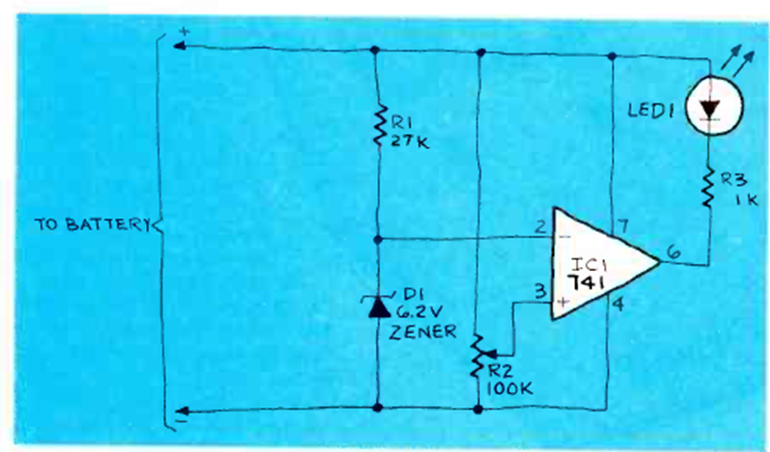 Este circuito es para baterías de 12 V pero se puede utilizar con baterías de otras tensiones cambiando el diodo zener. El ajuste del punto de activación se realiza en R1. El operacional admite equivalente.