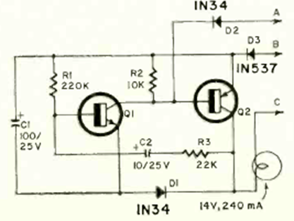 Este recordatorio de luces eléctricas para automóviles se encontró en la revista Radio Electronics de mayo de 1970. El circuito utiliza transistores de propósito general de la época y una bombilla que se puede reemplazar con LED.