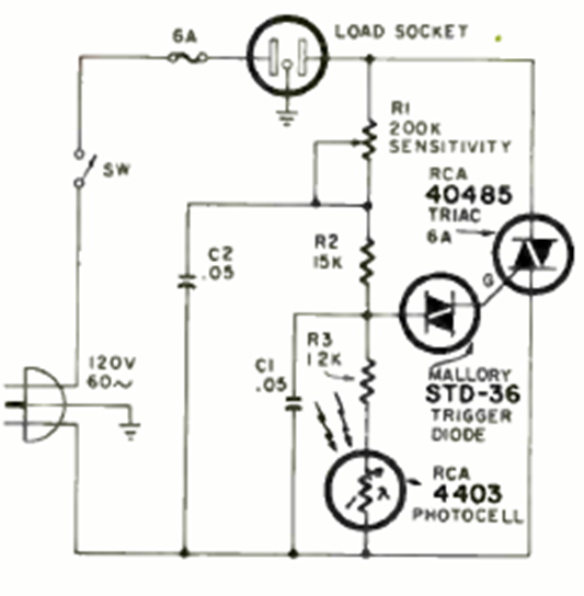 Este circuito para lámparas incandescentes fue encontrado en la revista Radio Electronics de febrero de 1972. El triac es según la potencia de la lámpara y el ajuste de sensibilidad se realiza en R1.