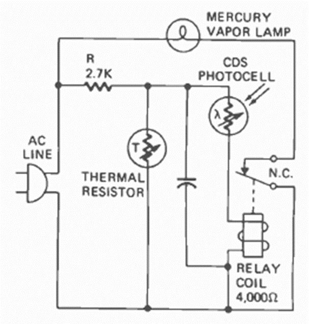 Este circuito lo encontramos en la revista Radio Electronics de noviembre de 1974. El circuito tiene un elemento de compensación que evita que los cambios de temperatura ambiente alteren el punto de disparo.