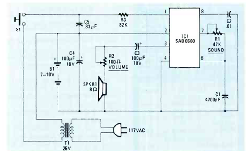 Este circuito fue encontrado en la revista Radio Electronics de abril de 1984. El circuito integrado utilizado es un tipo de la época que ya incluye la fuente de alimentación.