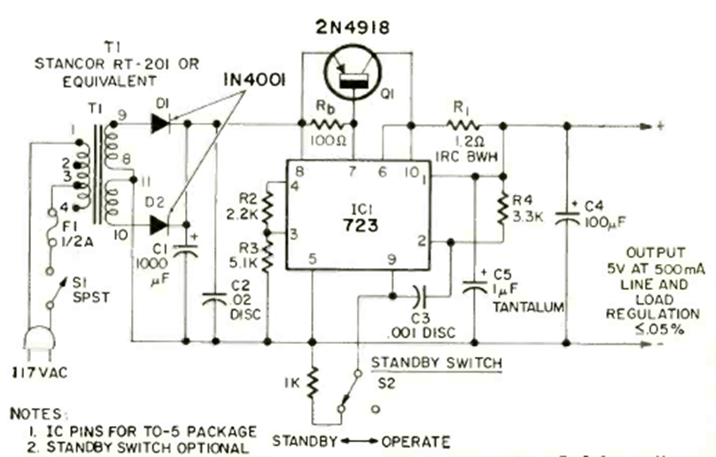 Utilizando el circuito integrado 723, este circuito se encontró en un artículo sobre fuentes en la revista Radio Electronics de agosto de 1971. El transistor podría ser el BD136 en un disipador de calor.