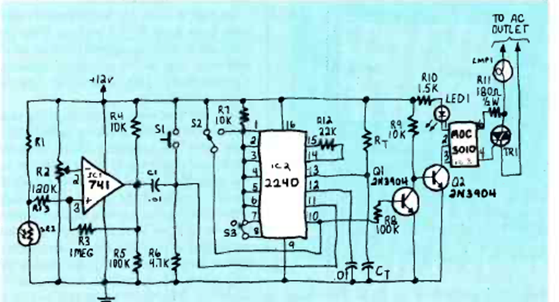 Este circuito se encontró en la revista Radio Electronics de abril de 1984. El circuito impulsa directamente un TRIAC para una carga de alta potencia.