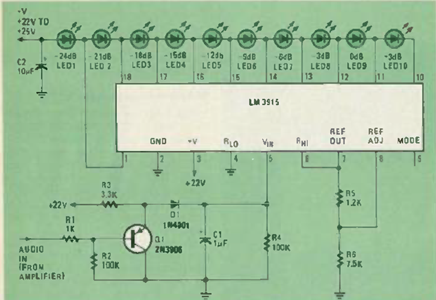 Este circuito de gráfico de barras con el LM3914 se encontró en la revista Radio Electronics de octubre de 1980. Tenga en cuenta el uso de un transistor para modificar la respuesta.