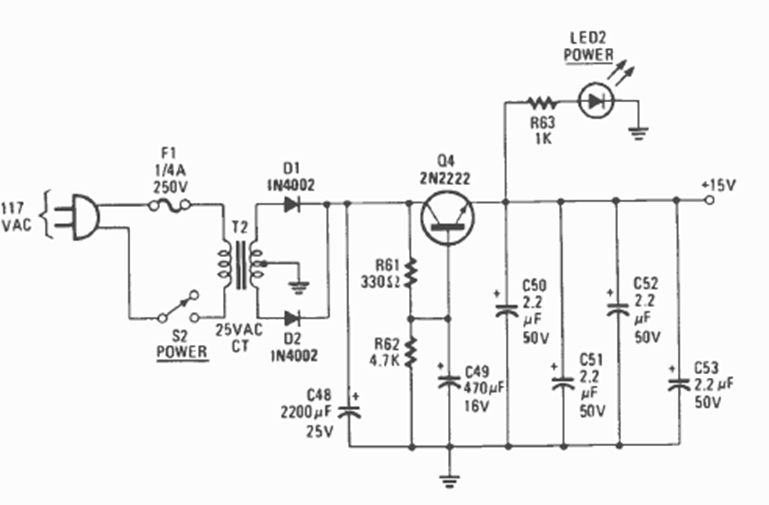 Esta simple fuente de 15 V se encontró en un artículo que describe un ensamblaje en la revista Radio Electronics de enero de 1987. La fuente se utiliza para alimentar el circuito descrito.