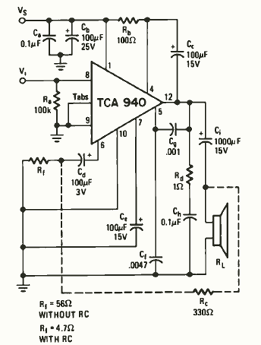 Este amplificador de unos pocos watts fue encontrado en la revista Radio Electronics de agosto de 1975. El circuito se utilizó en muchos equipos comerciales de la época. Cc determina la ganancia.