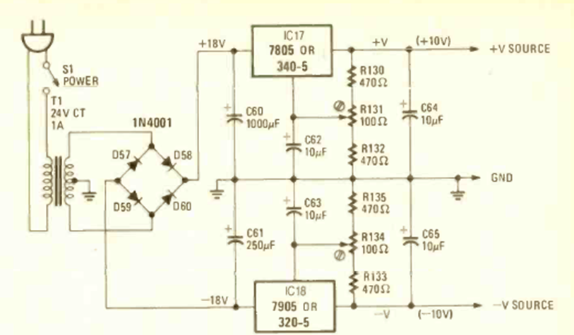 Este circuito fue encontrado en la revista Radio Electronics de marzo de 1979. Los circuitos integrados deben estar equipados con disipadores de calor. La corriente máxima es 1 A.