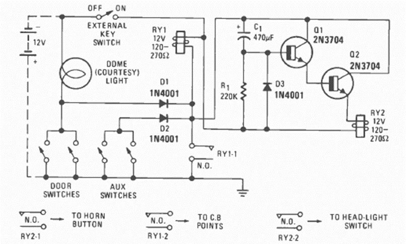 Este circuito para inmovilizar el sistema de encendido de un coche lo encontramos en la revista Radio Electronics de diciembre de 1976. El circuito utiliza los interruptores para activar las luces de cortesía.
