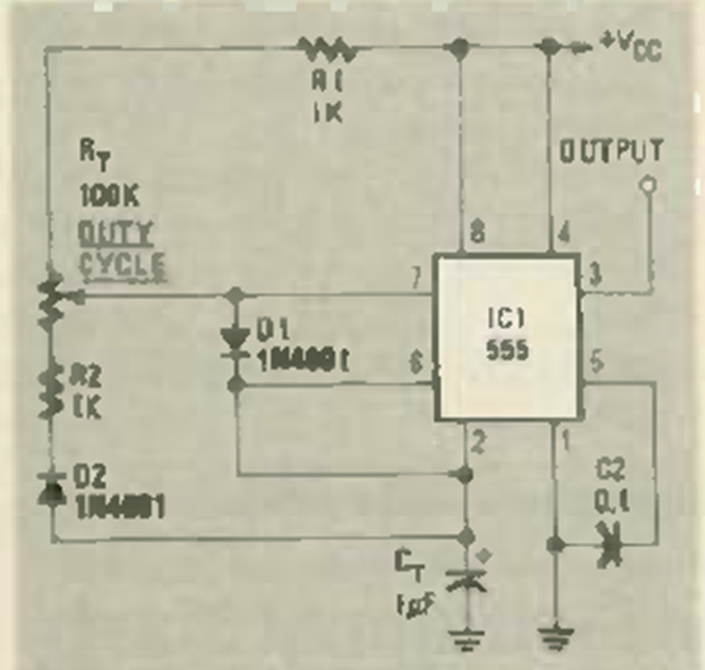 Este circuito permite variar el ciclo activo sin cambiar la frecuencia. Una aplicación interesante para controles PWM. El circuito es de una revista Radio Electronics de julio de 1985.