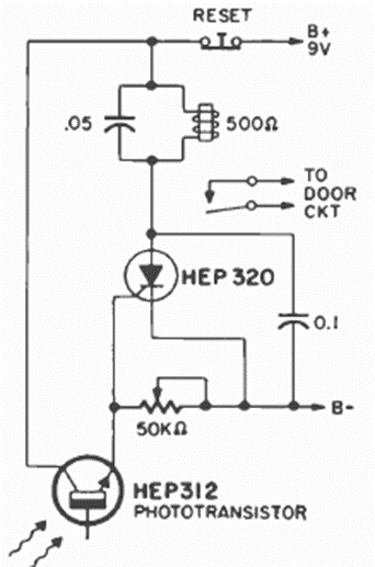 Este circuito de automatización con SCR fue encontrado en una revista de Radio Electronics de abril de 1971. El circuito activa un relé que abre la puerta del garaje.