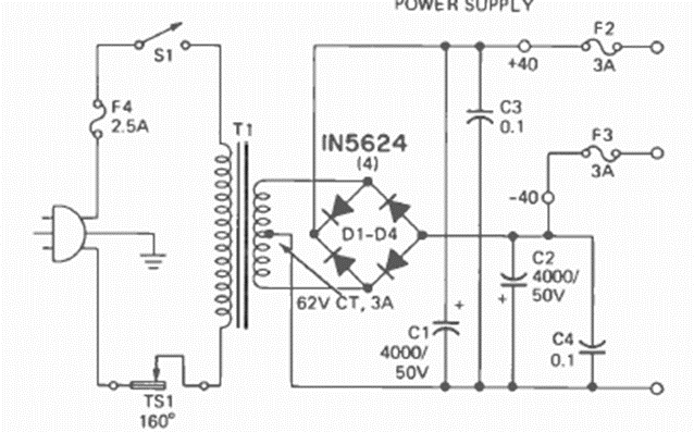 Esta es la fuente de alimentación del amplificador del circuito anterior. Lo encontramos en la misma revista Radio Electronics de marzo de 1973. El transformador es de 62 V x 3 A y la alimentación es simétrica.