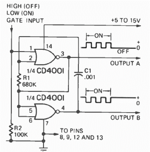 La frecuencia de este oscilador depende del capacitor y de R1, que se puede cambiar. El circuito fue encontrado en la revista Radio Electronics de noviembre de 1974.
