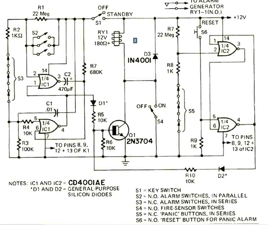 Este circuito con sensores NO y NC (serie y paralelo) lo encontramos en la revista Radio Electronics de abril de 1975. El circuito tiene un circuito de pánico y funciona con una fuente de alimentación de 12 V o dependiendo del relé utilizado.
