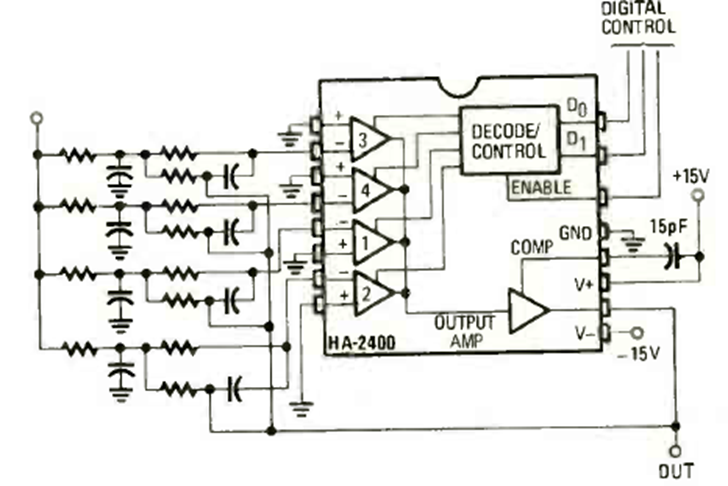 A través de control digital, este circuito activa los filtros de entrada que tienen las frecuencias seleccionadas por sus componentes. El circuito es de una Radio Electronics de marzo de 1980. El circuito integrado es el HA2400.