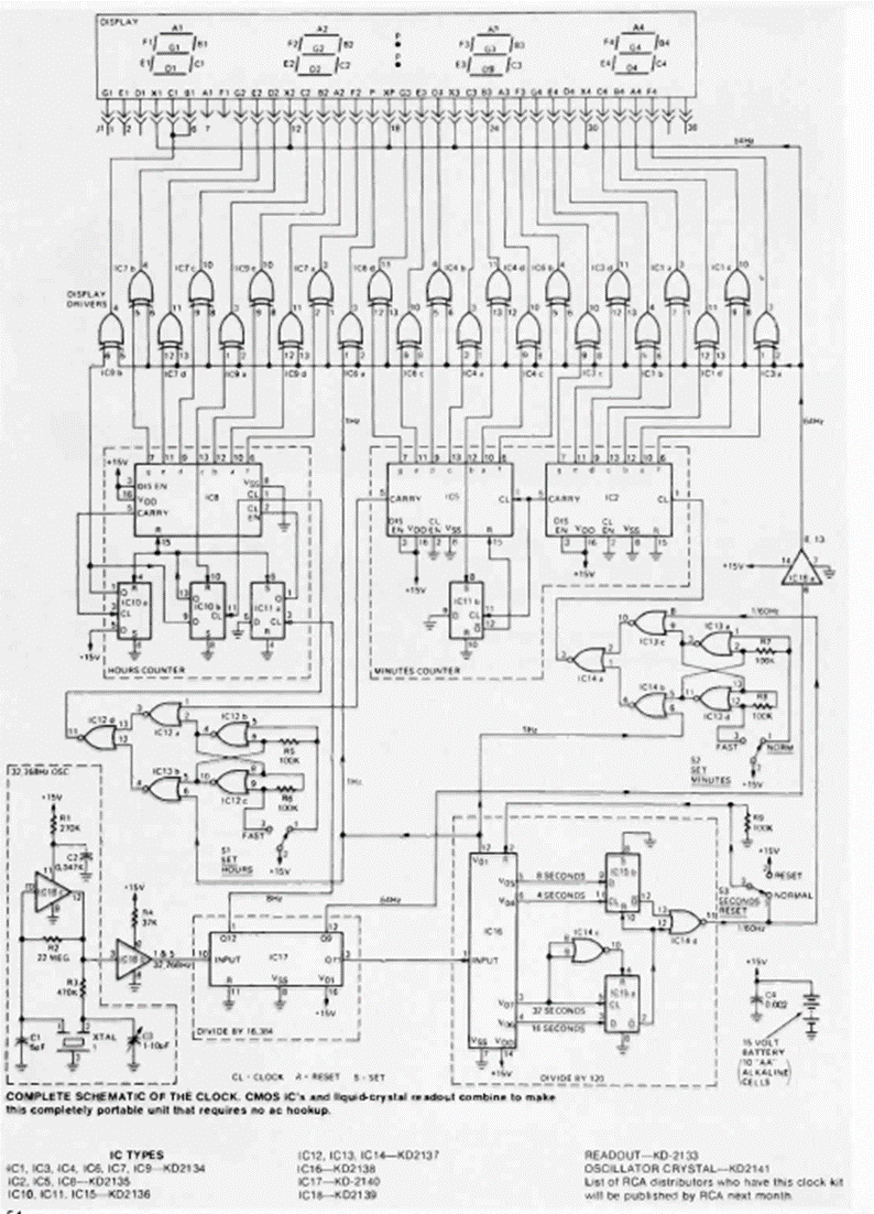 Este circuito basado en lógica CMOS se encontró en la revista Radio Electronics de abril de 1974. El circuito se basa en un display indicador de la época y tiene indicaciones de horas y minutos.