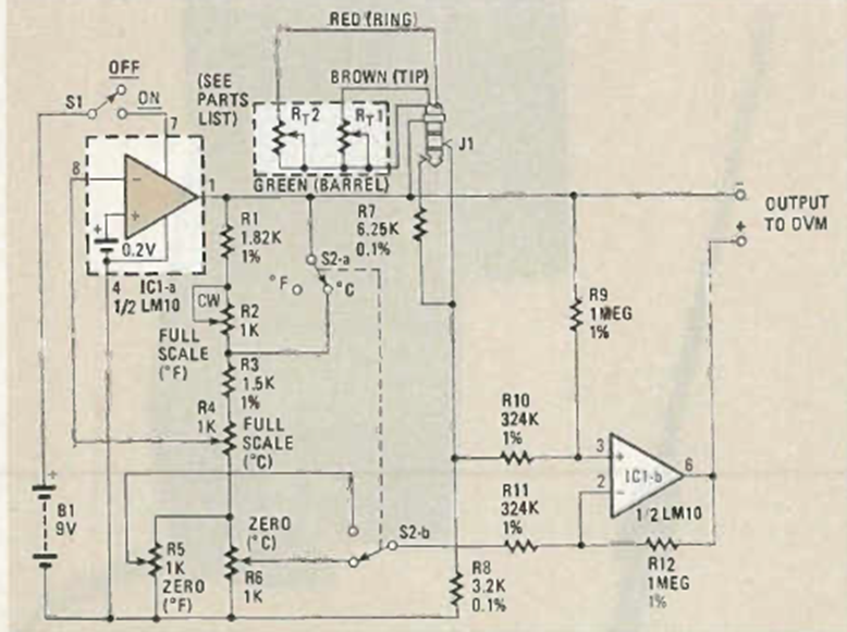Este circuito fue encontrado en la revista Radio Electronics de junio de 1985. La idea es utilizar un multímetro común para medir temperaturas. El sensor es un circuito integrado LM10. El circuito mide de 0 a 100º mediante un multímetro analógico.
