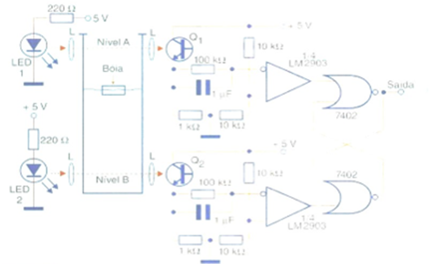 Texas Instruments también sugiere este circuito, que se ve en la figura, y muestra cómo se puede controlar el nivel de un depósito de agua (u otro líquido transparente) mediante sensores de flujo. Lo que tenemos son dos sensores que se sitúan en diferentes niveles del depósito, centrándose en fuentes de luz, que en este caso son LED. Cortar el haz de luz mediante un flotador hace que los circuitos del sensor actúen sobre un flip-flop TTL ensamblado con compuertas 7402, cambiando su estado. Así, tenemos la producción de señales en los niveles A y B, que sirven tanto para encender una bomba para llenar el depósito en el nivel B como para apagarla cuando el flotador alcanza el nivel A. El circuito debe alimentarse con 5 V y La alta sensibilidad requiere que las fuentes de luz de los LED estén estrictamente dirigidas a los sensores, que no pueden recibir luz de otras fuentes.