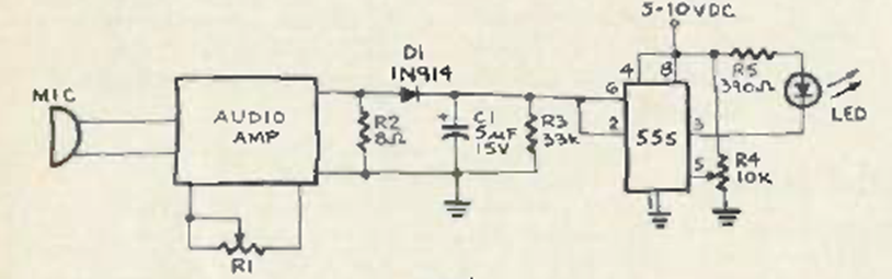 Este circuito detecta cuando una señal de audio excede un cierto nivel o incluso ocurre cuando cae un objeto, se cierra una puerta o algo más. El circuito es de una Radio Electronics de enero de 1980.