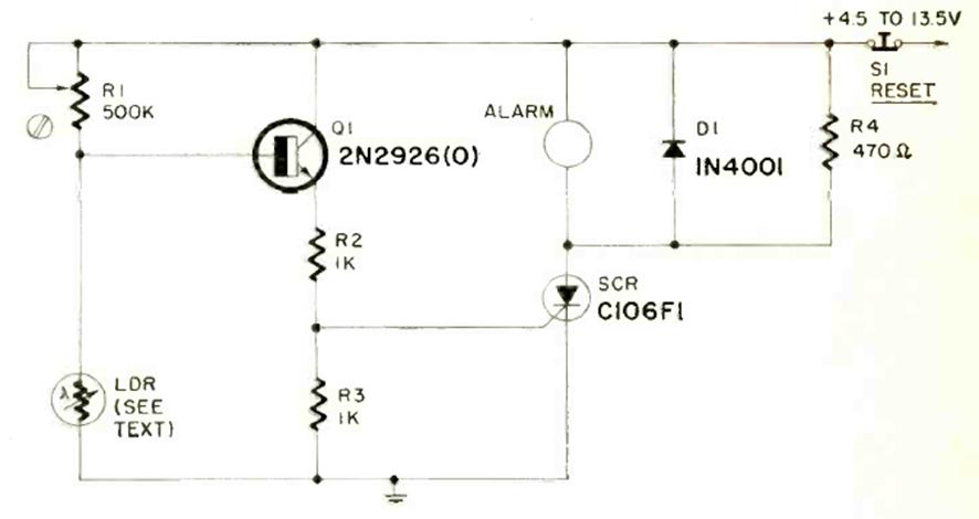 Este circuito sensible fue encontrado en la revista Radio Electronics de agosto de 1971. El SCR admite equivalente y el transistor puede ser un BC548. La carga puede ser un relé.