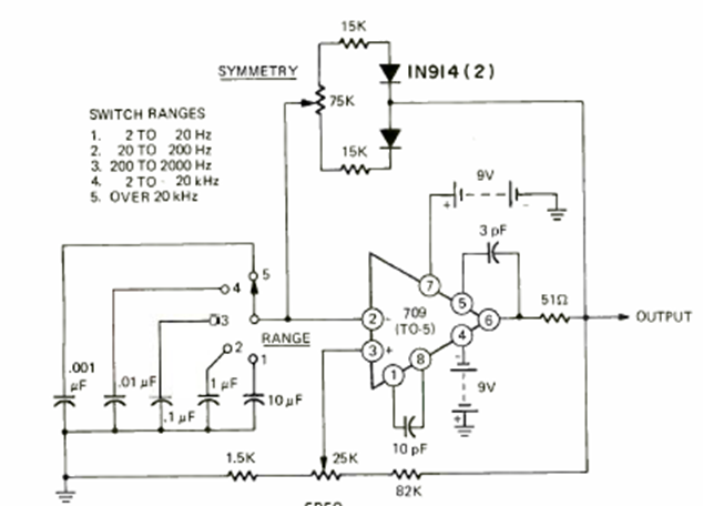 Utilizando el circuito integrado 709, uno de los primeros operacionales, este circuito fue encontrado en la revista Radio Electronics de junio de 1972. Ekle genera señales de 2 Hz a 20 kHz en 4 bandas. Por encima de 20 kHz hay una banda, pero ya se producen deformaciones de la señal.