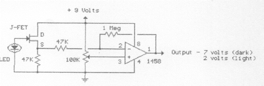 Este circuito que encontramos en documentación de 1990 utiliza un LED como sensor. El amplificador operacional es equivalente al 741 y el ajuste del disparo se realiza con el potenciómetro.