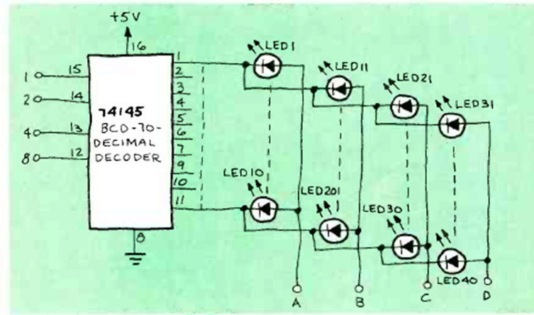 Este circuito TTL es de una revista de Radio Electronics de noviembre de 1983. El circuito controla un conjunto de LED. El circuito integrado utilizado es un decodificador BCD a decimal.