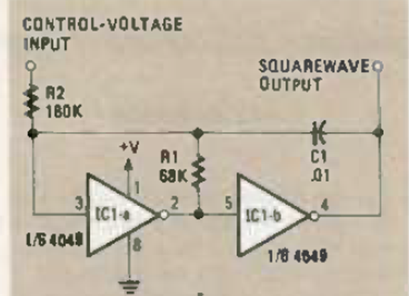 Este es un oscilador simple controlado por tensión que utiliza el 4049. La frecuencia básica viene dada por C1. La señal generada es rectangular y la tensión de alimentación puede estar entre 3 y 12 V.
