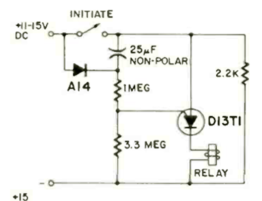 Este circuito temporizador utiliza un transistor unijuntura programable. El tiempo lo da el capacitor y el relé es sensible según la tensión de alimentación. El circuito es de una Radio Electronics de noviembre de 1970.