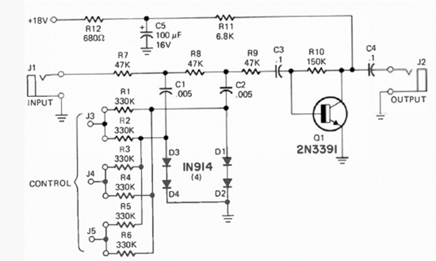 Este circuito apareció en la revista Radio Electronics en septiembre de 1973 y fue recomendado para un proyecto de sintetizador. El circuito es para señales de audio y tiene entradas de control.