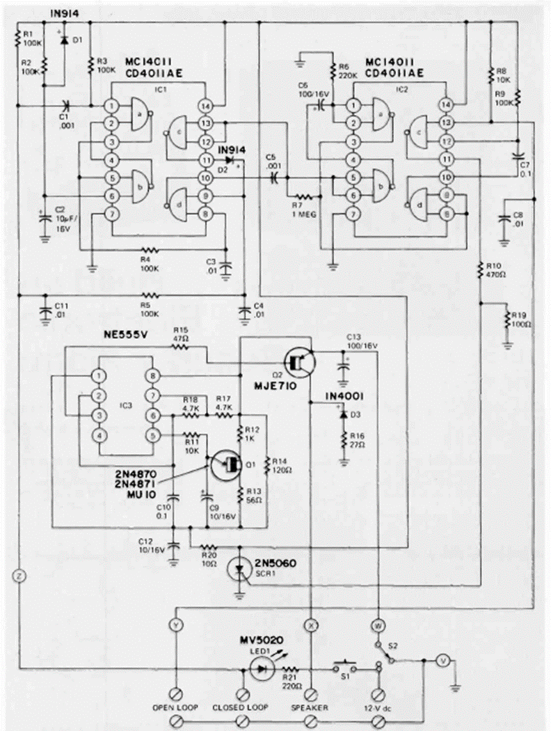 Este circuito, que apareció en la revista Radio Electronics de abril de 1974, se basa en la tecnología CMOS que se estaba volviendo más popular en ese momento. El circuito de alarma tiene varias entradas de sensores e incluye un sistema de alerta sonora.