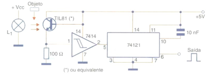 El circuito de la figura lo sugiere Texas Instruments en su manual de optoelectrónica y consiste en un sensor que pasa objetos en una línea transportadora de ensamblaje. Este circuito utiliza un fototransistor para detectar el paso del objeto, el cual genera una transición lógica en una puerta de disparo tipo 7414. Esta transición se utiliza para disparar un TTL monoestable, que genera un pulso de conteo o control de duración constante en el pin 6 de salida. La duración de este pulso depende de la resistencia de 15 kohm y del capacitor de 10 nF, componentes que se pueden cambiar según la aplicación deseada.