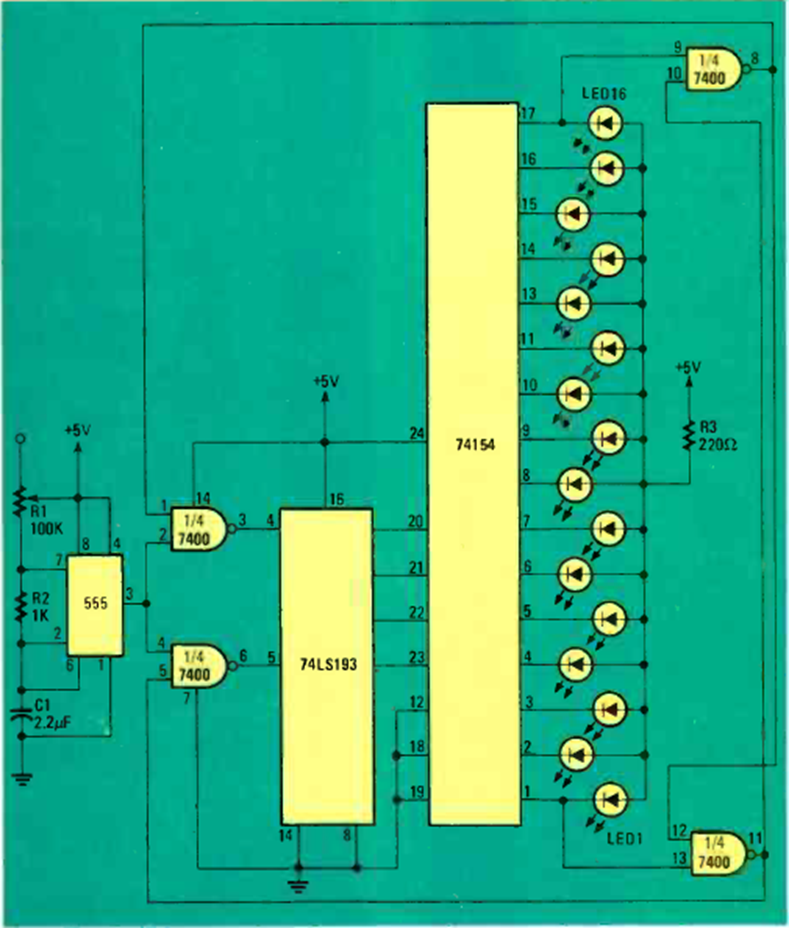 Este circuito de secuencia TTL se encontró en la revista Radio Electronics de enero de 1981. La alimentación debe ser de 5 V. La frecuencia se puede ajustar en R1.