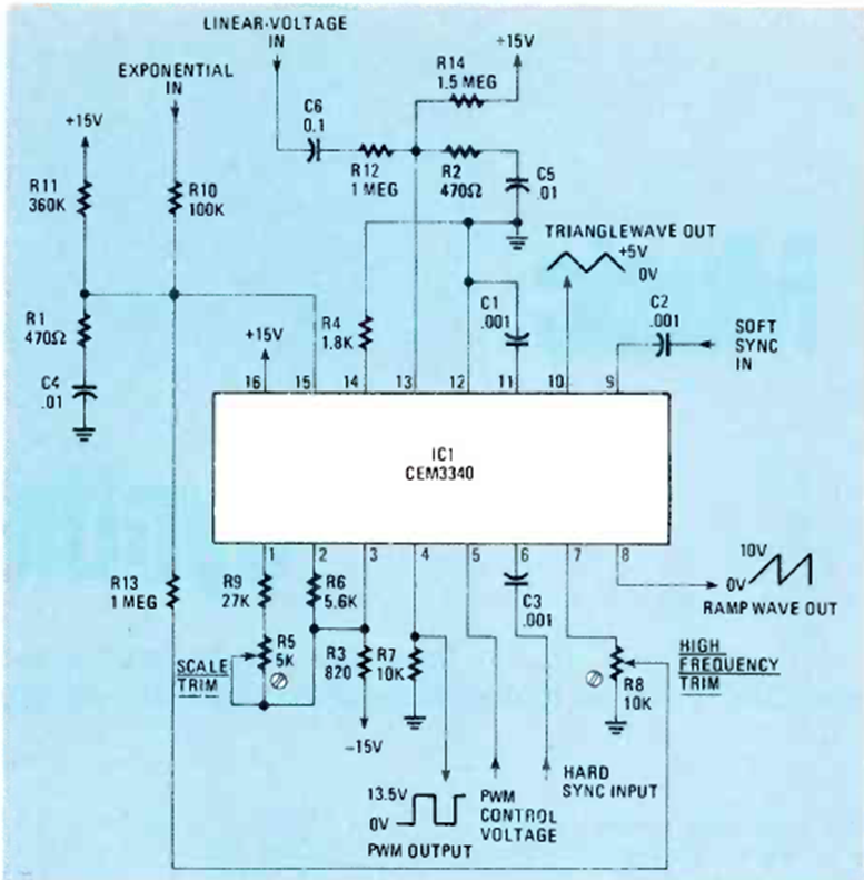 Este circuito apareció en la revista Radio Electronics de mayo de 1983. Está basado en el circuito integrado dedicado CEM3340. El circuito proporciona señales con diferentes formas de onda.